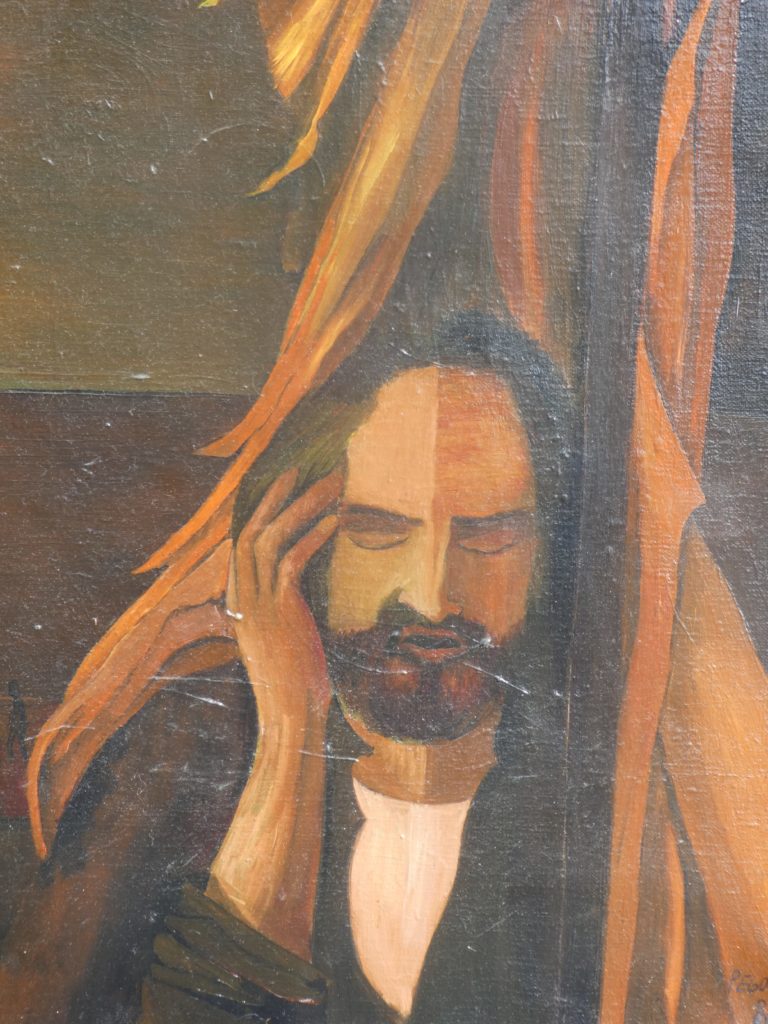 Sacré Lucien ! en relation avec des écritures sur une période chère à mon coeur ! Tableau appartenant à Mathieu, mon fils aîné. Huile sur toile, voilà bien longtemps. L’homme au drapeau piteux.